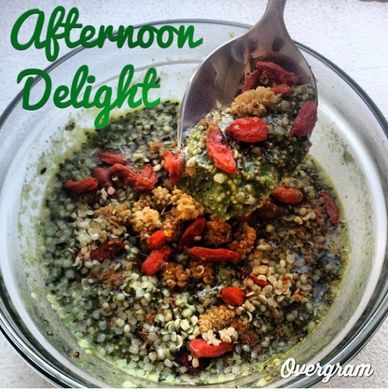 What are u snacking on in between lunch and dinner ? POPPED AMARANTH WITH CINNAMON SAUCE: 1/2 c Popped amaranth drenched in this greensmoothie made in blender: 1 c almondmilk 2 c spinach 1/2 banana cinnamon to your liking and a few icecubes. Pour this over amaranth and mix. Top it with gojiberries mulberries hempseed and drizzle of honey and a few extra dashes of cinnamon.