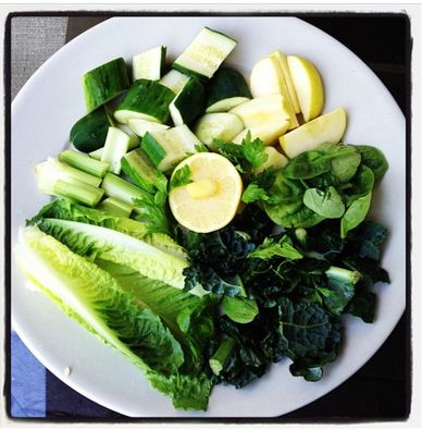 Yummy pre-workout breakfast! I blend (not juice!) this green hulk of goodness in a vitamix...just add a cup of water and a few ice cubes... Fresh organic Kale, spinach, romaine, parsley, celery, cucumber, golden delicious apple, lemon and ginger..