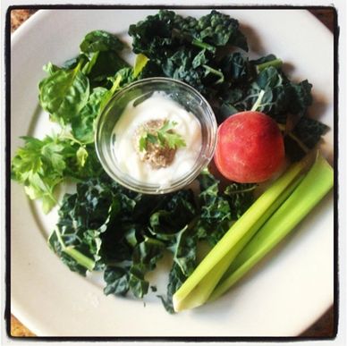 The BIIIG salad (throwback to Seinfeld anyone?). I love this salad, it's one of my favorites! ~~~~~Boston lettuce, kale, minced fresh Italian parsley and then I used my mandolin to spiralize raw zucchini, cucumber and radishes and sliced red onion. ~~~~Avocado dressing: in mini blender combine 1 avocado, 1/2 fresh squeezed lemon, 1 tsp fresh thyme, sea salt, black pepper, ground cumin. Then simply toss salad and the creamy avocado dressing together and enjoy 👌😋 the spiralized veggies add a unique texture to the salad and the creamy dressing is just finger lickin' good!