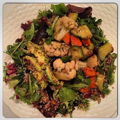 Hearty Salad for Dinner tonight! Mixed field greens, black beans, bicolor quinoa, pepitas, red onion, sautéed cauliflower, carrots and zucchini, 1/4 avocado with carrot ginger salad dressing. It's the kinda salad you just dig into, one eye flutters and u just say Mmmmm (or is that just me??! 🙈)